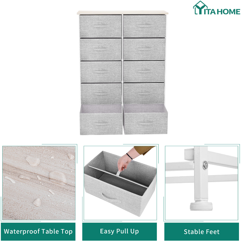 QUALITY CONSTRUCTION - Made with a powerful metal frame and durable MDF wooden top; contains 10 removable and foldable drawers with easy-to-pull fabric handles; features 4 adjustable plastic legs that prevent scratches to your floor.