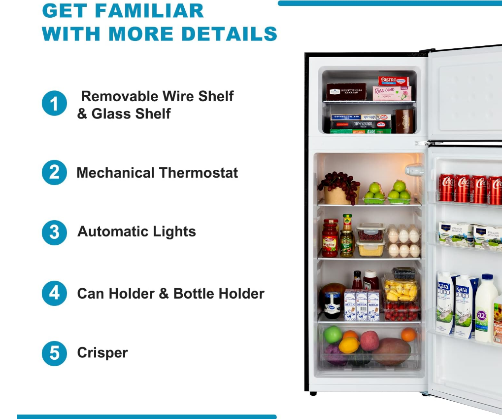 • 7 Adjustable Temperature Control: From 21.2°F to -0.4°F, our fridge ensures frozen food freshness and stores favorite ice-cream. Performed from 32°F to 50°F in refrigerator zone, the refrigerator keeps ingredients fresh and locking moisture.