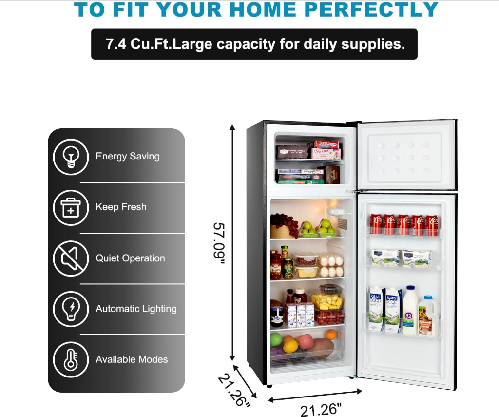 • Large in Capacity: No more worries about plenty food from limited space to store them. Our apartment size refrigerator possesses a much deeper and enlarged space of 21.26 x 21.26 x 57.09" with large capacity to keep all your food totally fresh.