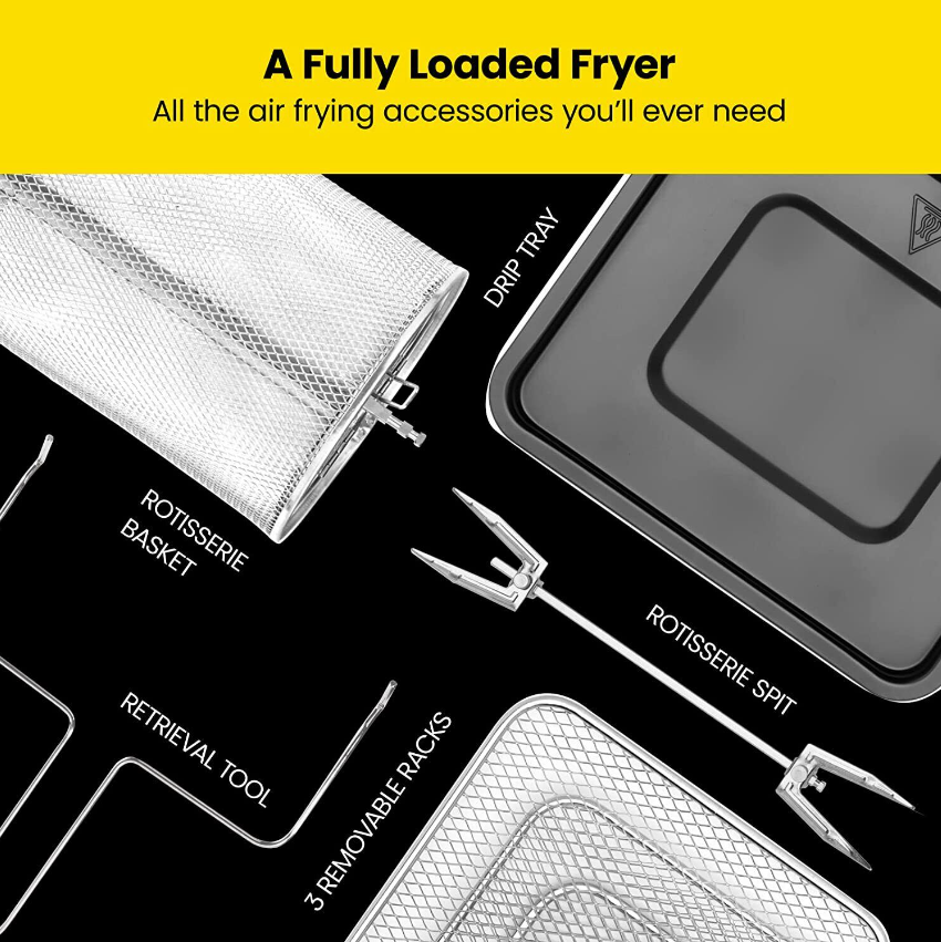 All-inclusive: Includes three air flow racks, stainless steel rotisserie oven spit and forks, stainless steel rotating basket/retrieval tool, and a drip tray.