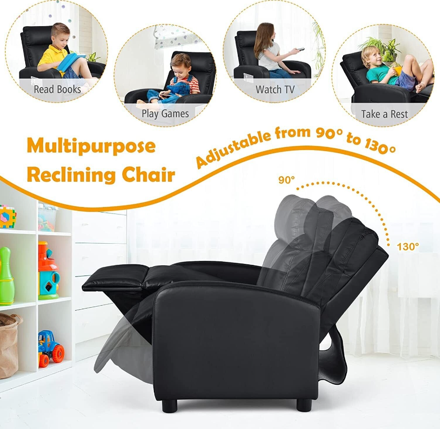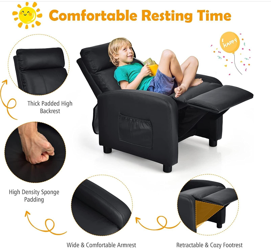 Costzon Kids Recliner, Adjustable PU Leather Lounge Chair w/Side Pockets, Footrest, Headrest for Kids Room & Play Room, Easy to Clean, Padded Recliner Sofa for Children Boys Girls Aged 3-12 (Black)