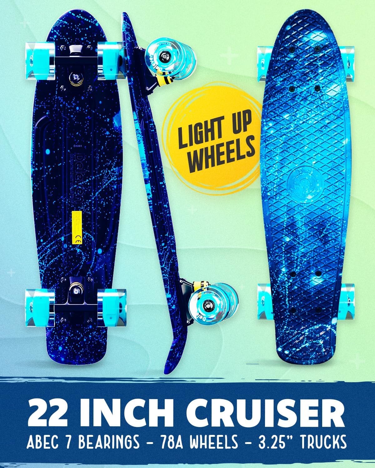 Deleven 22” Skateboard for Kids with Bright LED Wheels - Complete Gift Set with Carry Bag & Skate Tool - Mini Cruiser Retro Light Up Skateboard Made for Beginners, Girls & Boys