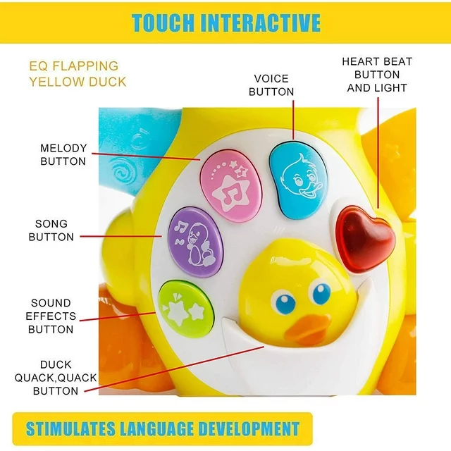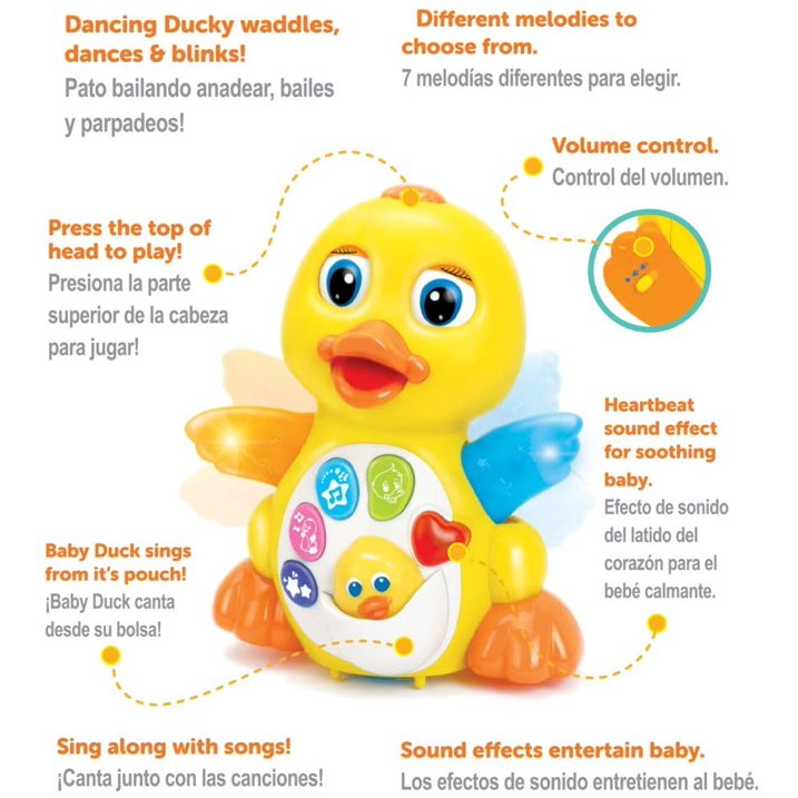 Make playtime and learning fun with HANMUN Walking Musical Dancing Yellow Duck. The little ducky will scoot around the home non-stop, providing endless entertainment for your young one. Features: Bump and Go Action, Wings flap and light up when the music begins, Lights, Music, and Talks (Adjustable Volume), Buttons on duck imitate duck sound and sing a tune Anytime the duck bags into something it just backs up and goes another way instead of just being stuck. It works a little smoother and quicker on the floor but works fine on the carpet.