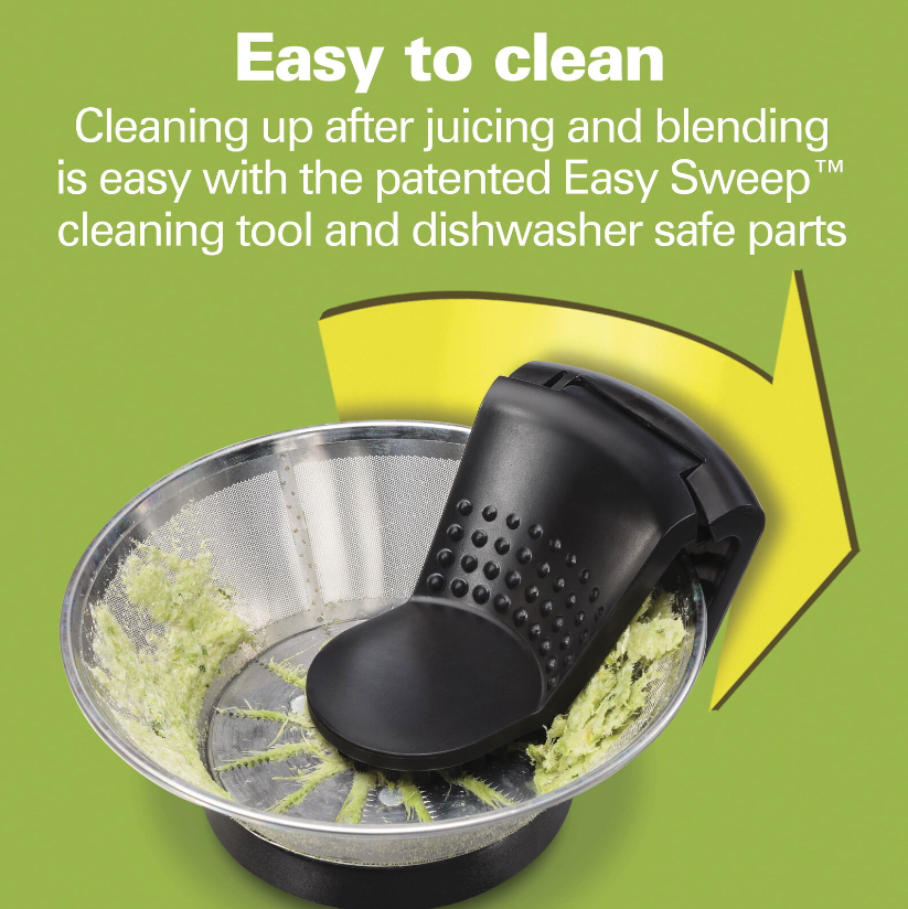 Juicing and blending go hand-in-hand as part of a healthy lifestyle, and now you can juice and blend with one space-saving appliance. Thanks to its versatile 2-in-1 design, the Hamilton Beach Big Mouth® Juice & Blend 2-in-1 Juicer and Blender makes fresh juice from whole fruits and vegetables, which you can add to all your favorite blended recipes. You’ll save time as you juice because the 3" Big Mouth® chute fits whole produce, and by replacing the juice extractor attachment with the 20 oz. blender jar, you can juice directly into it — no need to transfer juice from one container to another. With this versatile 2-in-1 appliance, you can go from making simple juice to creating a wide variety of flavorful smoothies, shakes, cocktails or slushies. You'll easily power through tough ingredients like hard produce and ice with its 800 watt, 2 speed motor and pulse. Amp up your nutrition and add more flavor to your life today — recipes are included to get you started. Includes patented Easy Sweep™ cleaning tool and removable, dishwasher safe parts for easy cleanup. Backed by Hamilton Beach, the #1 brand in juice extractors