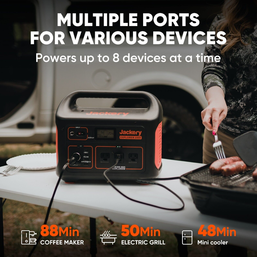 • Power Pretty Much Anything: Power 90% home appliances with 1002Wh (1000W AC output power) and 8 outlets (3*AC outlet, 1*USB-A , 1*USB-A quick charge 3.0, 2*USB-C PD, 1*Car outlet). Ideal for outdoor off-grid activities and home backup power to power refrigerator, TV, mini cooler, electric grill, fan, and more for your outdoor and home needs.