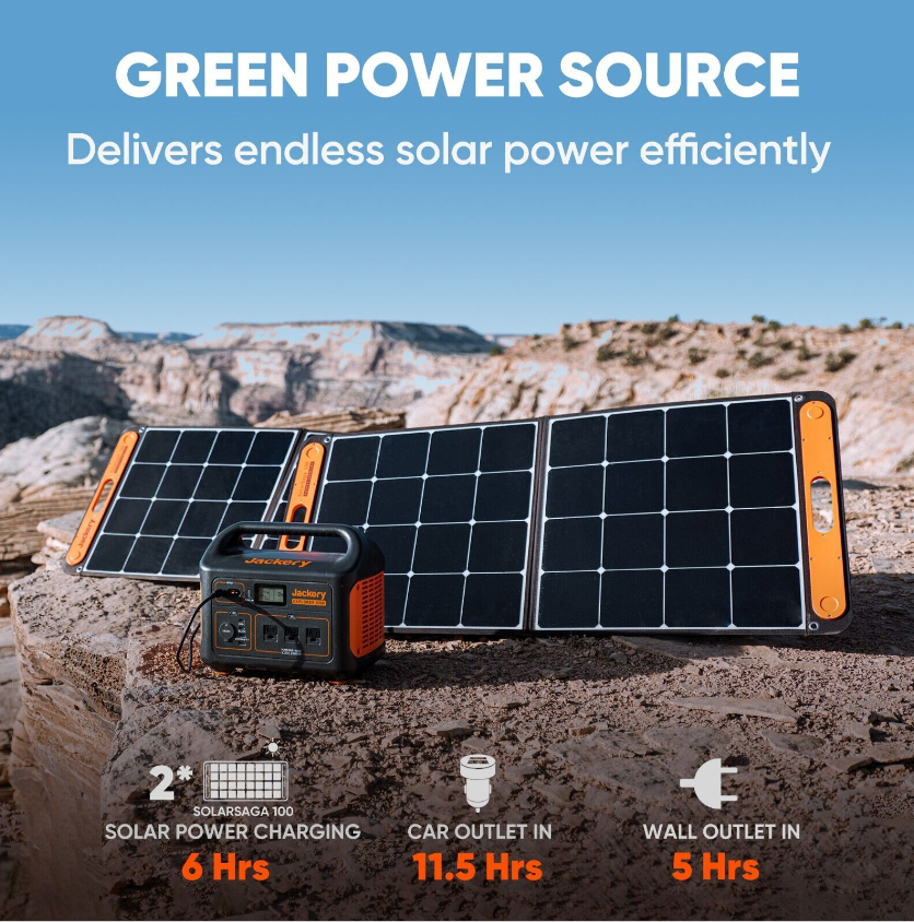 • Clean and Unlimited Solar Energy: 100% green energy with smart MPPT controller for optimal charging efficiency. The power station can be fully charged with 2 Jackery SolarSaga 100W solar panels (Should be bought separately) within 6 hrs or only 5.5 hrs via AC wall outlet charging. Ideal for your camping or family emergency storage.