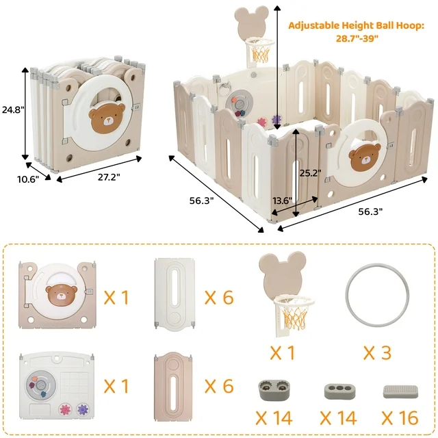 Package Include: 12x Small Panels 1x Game Board 1x Gate with Safety Lock 1x Ball Hoop with Net 1x Ball 3x Rings 1x Installation Manual